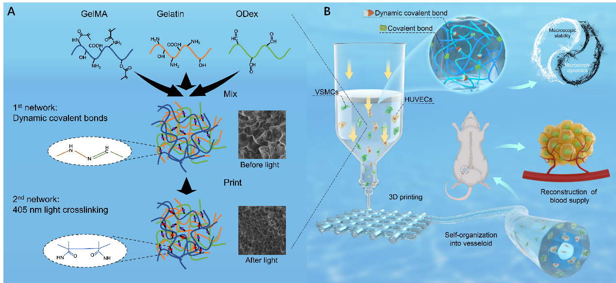 血管化是目前限制大尺寸組織工程支架構(gòu)建的關(guān)鍵問題。盡管近年來人工血管/血管網(wǎng)絡(luò)的生物制造技術(shù)獲得了巨大的發(fā)展,但構(gòu)建具備仿生結(jié)構(gòu)以及收縮功能的血管網(wǎng)絡(luò)一直是領(lǐng)域重大挑戰(zhàn)。為解決上述問題,研究團(tuán)隊(duì)開發(fā)了一種具有動態(tài)共價(jià)交聯(lián)網(wǎng)絡(luò)的仿ECM生物墨水,通過模擬ECM的適應(yīng)性微環(huán)境和結(jié)構(gòu)組分,引導(dǎo)血管內(nèi)皮細(xì)胞和血管平滑肌細(xì)胞自發(fā)排列形成具有仿生雙層結(jié)構(gòu)的血管網(wǎng)絡(luò)。