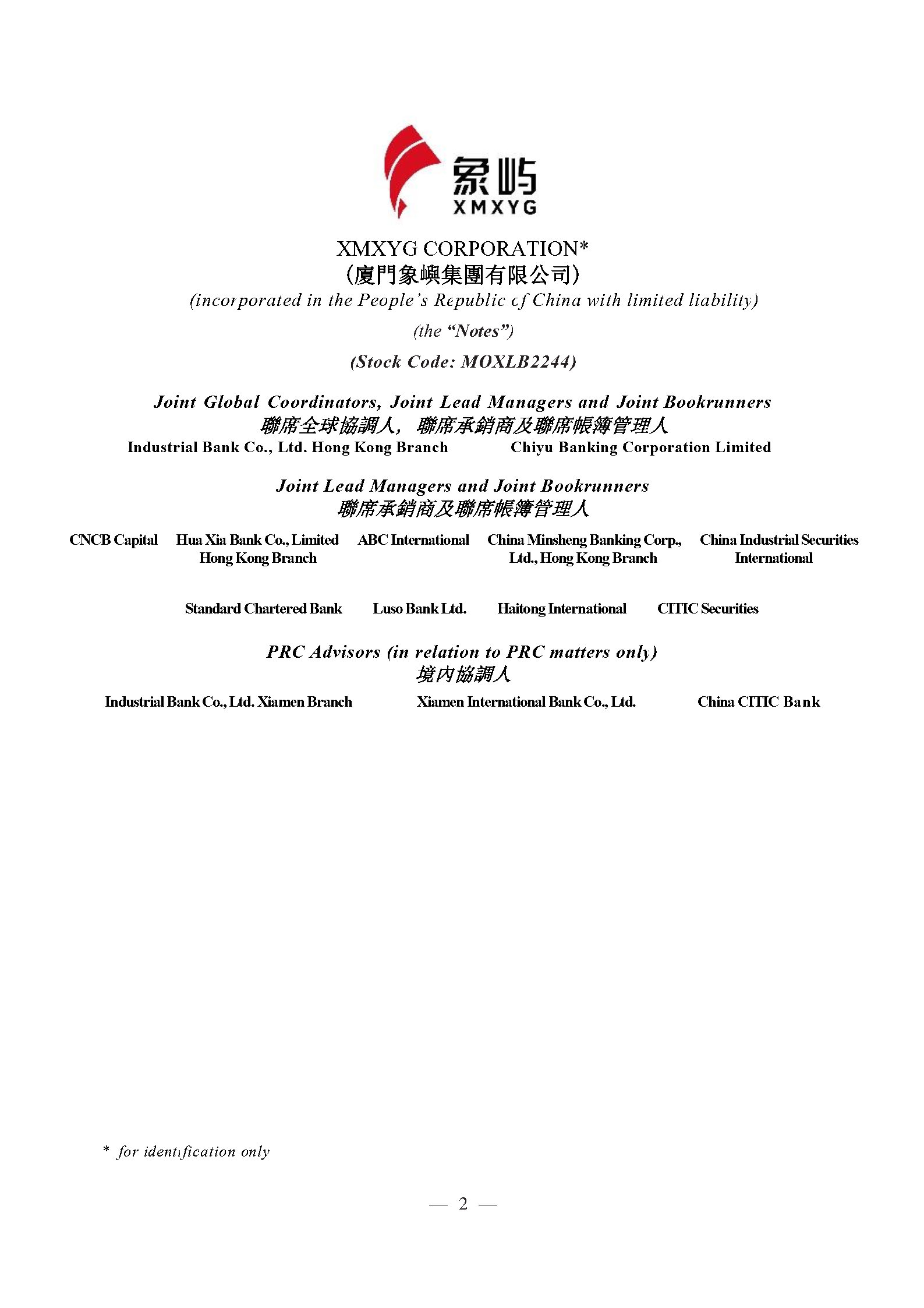 ANNOUNCEMENT IN RELATION TO THE LISTING OF THE NOTES ON CHONGWA (MACAO) FINANCIAL ASSET EXCHANGE CO., LTD. – HONGKONG XIANGYU INVESTMENT CO., LIMITED - U.S.$300,000,000 5.7 per cent. Guaranteed Notes due 2025