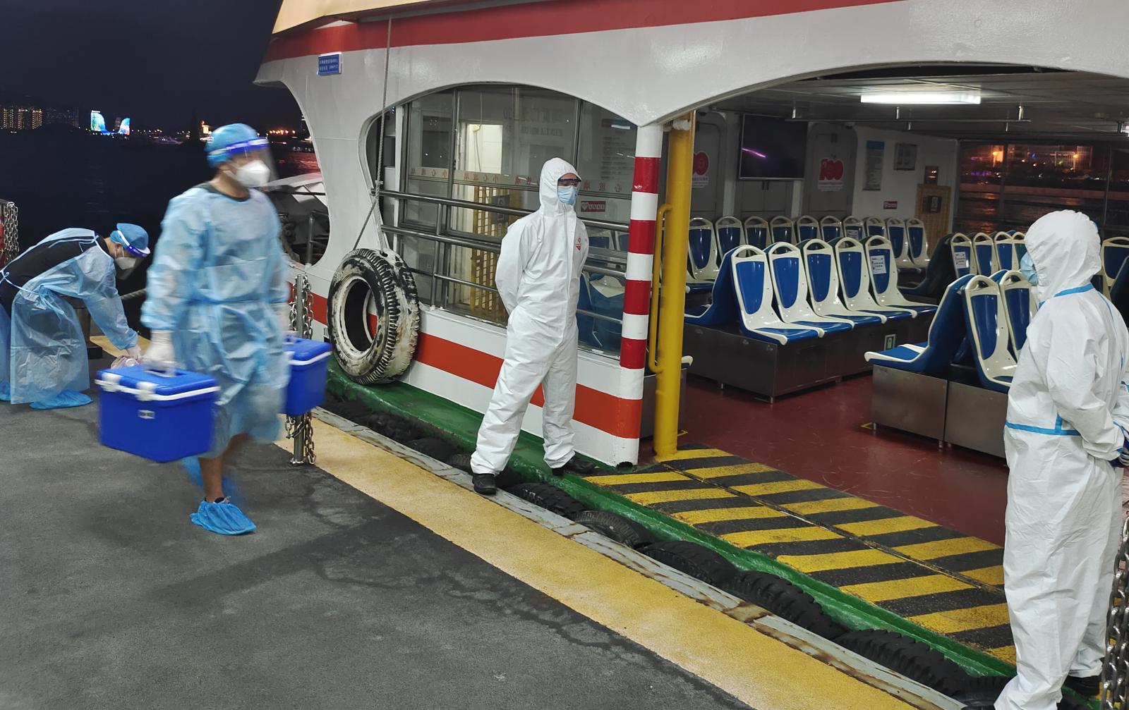 在疫情防控中,廈門輪渡公司還成立黨員突擊隊,調(diào)派“全國青年文明號”——“輪渡20”船作為發(fā)熱病人轉(zhuǎn)運專船,日夜守護人民群眾健康安全。轉(zhuǎn)運任務(wù)時常緊急且繁重,半夜出動也是家常便飯。但每當(dāng)任務(wù)來臨,他們總是毫無怨言,盡職盡責(zé)暢通“生命轉(zhuǎn)運線”,當(dāng)好人民群眾的“守夜人”。每每完成運送任務(wù)后,他們還要拖著疲憊的身軀,做好碼頭船岸的消殺工作。據(jù)統(tǒng)計,僅2022年期間,專船就轉(zhuǎn)運發(fā)熱病人 236趟次、中高風(fēng)險地區(qū)人員195趟次、核酸樣本589趟次。