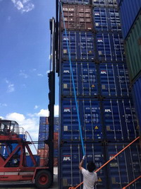 集裝箱堆積起來有20多米高,臺(tái)風(fēng)中,堆箱的穩(wěn)固性就顯得尤為重要。廈門、福州兩地的堆場早在前兩天就著手相關(guān)加固防護(hù)工作。8日白天,又有工作人員迎著大風(fēng)爬上樓頂檢查加固鋼架,不到臺(tái)風(fēng)來臨,時(shí)刻也不掉以輕心。