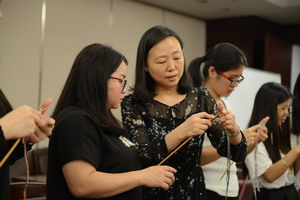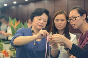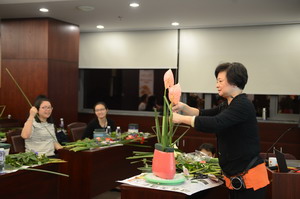 黃瑜勤老師示范插花并手把手教女職工們編織花葉