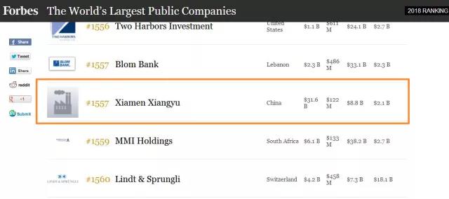 今日,美國(guó)《福布斯》雜志發(fā)布2018年“全球上市公司2000強(qiáng)”排行榜(Forbes Global 2000),廈門(mén)象嶼(600057)排名1557名,較去年躍升228位。