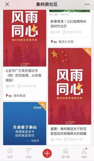 集團(tuán)以象嶼微社區(qū)為核心平臺(tái)載體,動(dòng)態(tài)發(fā)布權(quán)威信息,各區(qū)域各公司積極響應(yīng)宣貫。