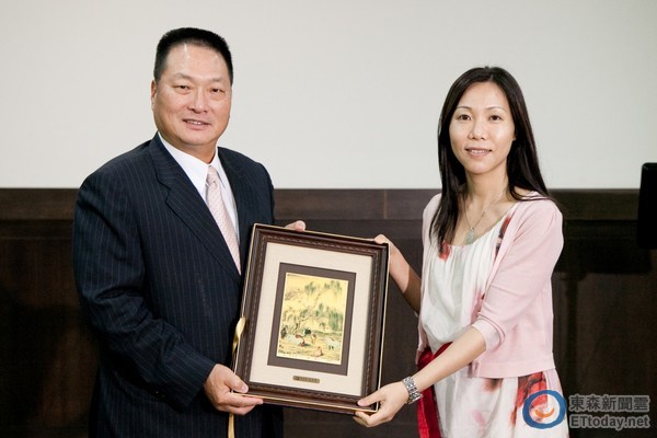 東森總裁王令麟(左)致贈郎世寧畫作「八峻圖」給來訪的廈門市商務(wù)局副局長鄭耀。(圖/ETtoday)
