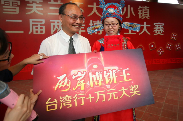 10月6日下午,首次由臺商冠名的“雪芙蘭杯大嶝小鎮(zhèn)第二屆兩岸博餅王大賽”在千人同臺爭奪“兩岸博餅王”的歡呼和吶喊聲中隆重舉行,這也意味著持續(xù)一個月圍繞“中秋博餅”和“購物”展開的第二屆大嶝小鎮(zhèn)中秋嘉年華暨第三屆兩岸特色旅游購物節(jié)活動落下帷幕,女狀元為廈門市民譚晶,她笑稱博餅的譚晶比唱歌的譚晶還幸運,從網(wǎng)絡(luò)博到現(xiàn)場,一路“過關(guān)斬將”奪得兩岸博餅王,贏得臺灣行+萬元大獎。
