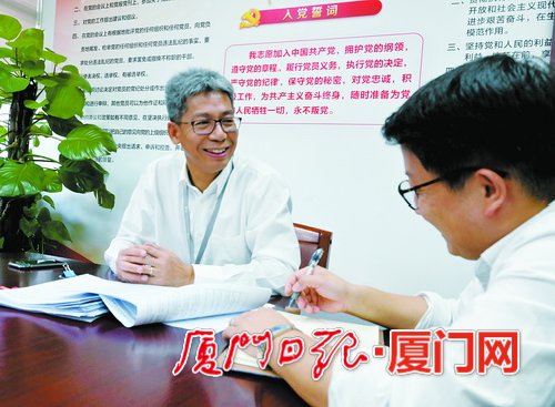 象嶼股份黨委副書記、副總經(jīng)理齊衛(wèi)東(左)跟員工探討項目落實情況。(《廈門日報》記者黃曉珍攝)
