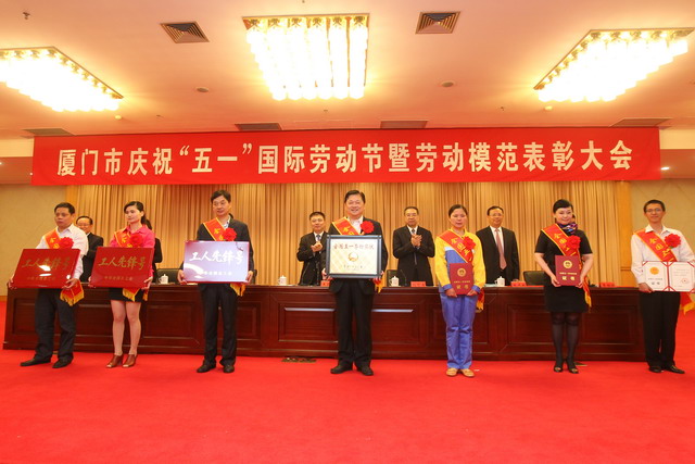 4月30日下午,廈門(mén)市慶?!拔逡弧眹?guó)際勞動(dòng)節(jié)暨勞動(dòng)模范表彰大會(huì)在人民會(huì)堂舉行。王龍雛董事長(zhǎng)從廈門(mén)市委書(shū)記王蒙徽手中接過(guò)了全國(guó)“五一勞動(dòng)獎(jiǎng)狀”,同時(shí)獲得大會(huì)表彰的還有榮獲“廈門(mén)市勞動(dòng)模范”稱號(hào)的集團(tuán)公司員工吳捷。