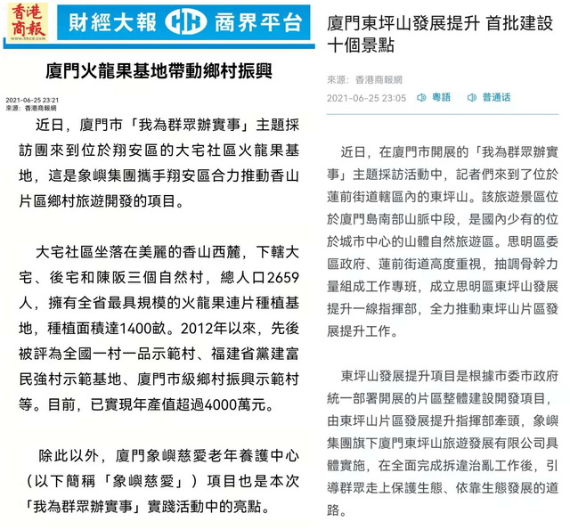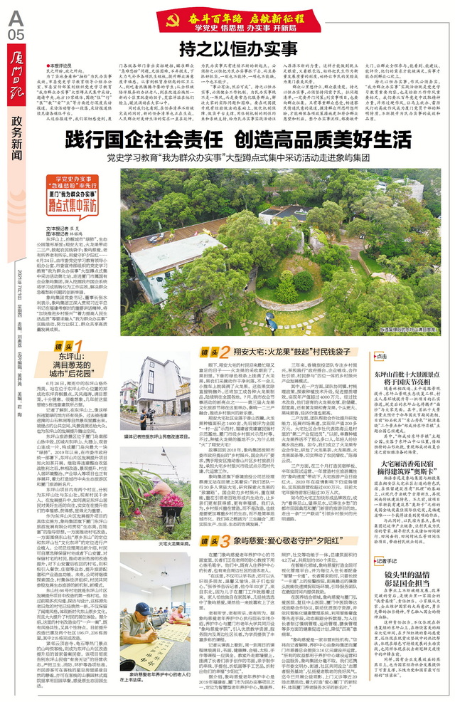 象嶼集團正以“我為群眾辦實事”實踐活動為抓手,深入學習貫徹習近平總書記重要講話精神,著力解決人民群眾急難愁盼問題,為百姓創(chuàng)造美好生活。近日,由廈門市委黨史學習教育領(lǐng)導小組辦公室、廈門市委宣傳部組織的黨史學習教育“我為群眾辦實事”大型蹲點式集中采訪走進象嶼集團。境內(nèi)外近20家媒體深入東坪山發(fā)展提升項目、大宅鄉(xiāng)村振興項目和象嶼慈愛老年養(yǎng)護中心,對象嶼集團辦實事、解民憂、惠民生的創(chuàng)新舉措進行集中報道。