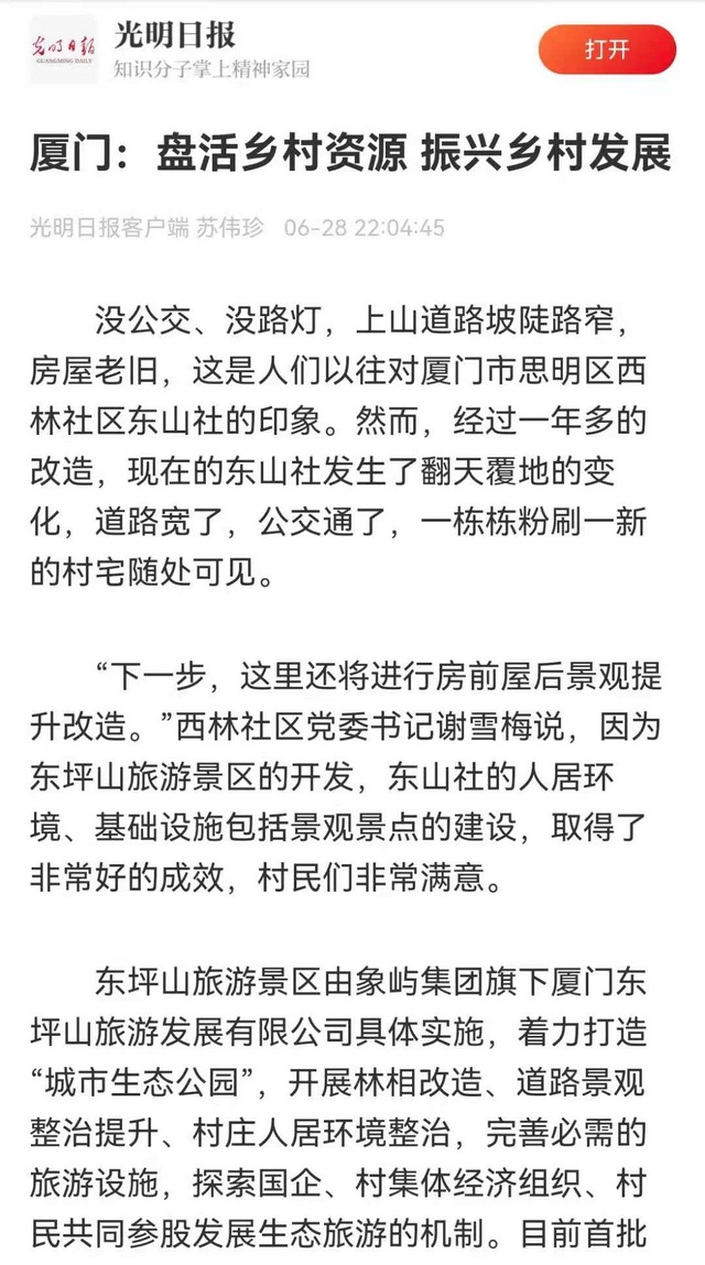 作為東坪山片區(qū)發(fā)展提升項目的具體實施方,象嶼集團旗下廈門東坪山旅游發(fā)展有限公司貫徹“生態(tài)美,百姓富”的指導思想,一方面推動村宅改造,一方面圍繞東山社“原鄉(xiāng)東山”的定位和東坪山社“文化東坪”的定位進行產(chǎn)業(yè)植入。公司總經(jīng)理周遠新介紹,村民可自愿選擇保留村宅或者下山安置,對保留村宅的村民,推動老舊危房的改造提升,對下山安置后收回的村宅,則積極引入餐飲、住宿等業(yè)態(tài),提升旅游配套和產(chǎn)業(yè)造血功能。未來,公司將繼續(xù)探索國企、村集體經(jīng)濟組織、村民共同參股發(fā)展生態(tài)旅游的新機制、新模式。