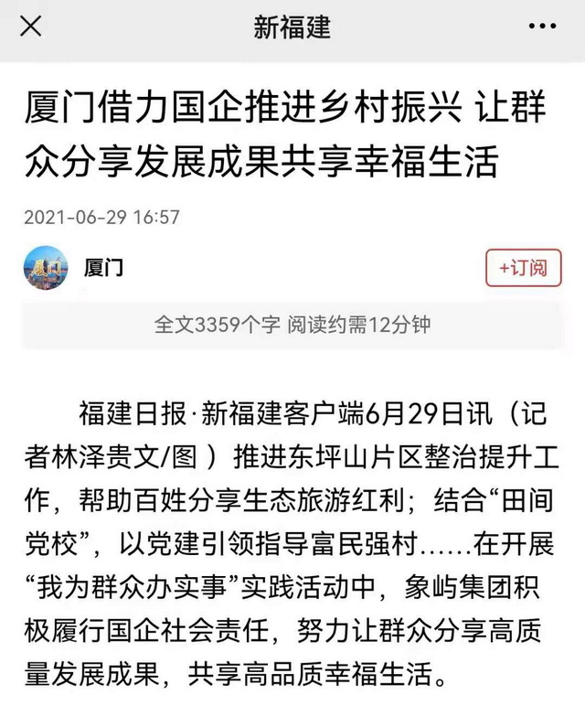 媒體對象嶼集團的工作成效予以充分肯定。廈門日報刊登記者手記指出:在事業(yè)上不斷破題發(fā)展、改革突破的背后,是鏡頭里象嶼這家國企的“俠骨柔情”、責任擔當。小家服從大家、企業(yè)維護國家的大局意識,勇當先鋒的擔當精神,早已融入象嶼的精神血脈。國有企業(yè)為國家經(jīng)濟社會發(fā)展提供了可靠支撐,不愧為黨和國家最可信賴的“頂梁柱”。