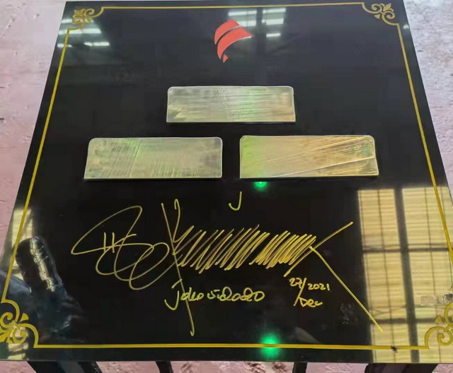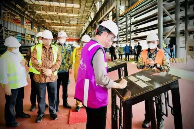 佐科參觀園區(qū)內(nèi)的象嶼印尼250萬噸不銹鋼一體化冶煉項目(以下簡稱象嶼印尼項目),并在鑲有公司產(chǎn)品(不銹鋼坯)的石牌上簽字留念。