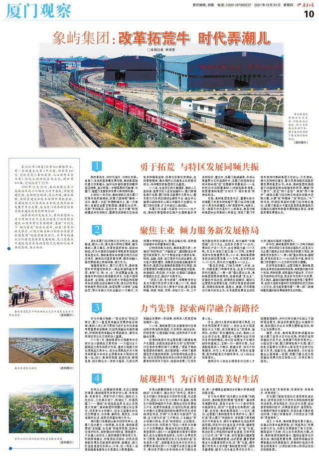 成長(zhǎng)在廈門經(jīng)濟(jì)特區(qū)這片熱土上,敢闖敢試、敢為人先、埋頭苦干的特區(qū)精神,賦予象嶼人勇立潮頭、改革創(chuàng)新的拼勁、闖勁和韌勁。作為中國(guó)供應(yīng)鏈服務(wù)領(lǐng)域卓有成就的領(lǐng)軍型企業(yè),象嶼集團(tuán)在加快建設(shè)現(xiàn)代化經(jīng)濟(jì)體系、推進(jìn)經(jīng)濟(jì)高質(zhì)量發(fā)展、服務(wù)和融入新發(fā)展格局上持續(xù)深耕、傾力作為。