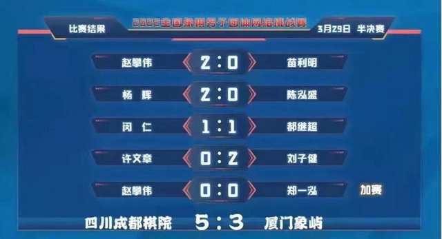 今年廈門象嶼象棋隊看點豐富,鄭一泓特大繼續(xù)領銜,團隊幾位大將都是棋壇屈指可數(shù)的風云人物,還大手筆引進“東北虎”趙國榮特大和“98黃金一代”劉子健大師。陣容調整后的廈門象嶼象棋隊,此次在過關斬將中充分磨合團隊、調整戰(zhàn)術,3月27日以6:2戰(zhàn)勝奪得過全運會、智運會團體冠軍的浙江隊,晉級四強;昨日半決賽,又與象甲聯(lián)賽三屆衛(wèi)冕冠軍四川隊幾番廝殺,互有勝負,最終以3:5惜敗。至此,廈門象嶼象棋隊取得本次團體網(wǎng)絡挑戰(zhàn)賽并列第三名的佳績。中國象棋協(xié)會在戰(zhàn)報中評價道,“鄭一泓特大領銜的廈門象嶼隊今年或許會成為一支不可忽視的力量,讓我們拭目以待。”