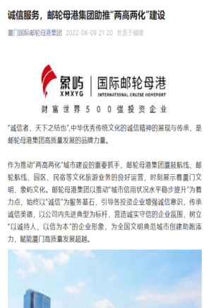 象嶼集團(tuán)旗下郵輪母港集團(tuán)立足郵輪母港集團(tuán)文化、為廣大市民、游客提供旅游服務(wù)的窗口特性,積極開展“集案例、樹典型”誠(chéng)信宣傳活動(dòng),征集挖掘誠(chéng)信服務(wù)故事,“輪渡公司的完璧歸趙”“碧海紅帆公司的信守不渝”“象嶼發(fā)展公司的拾金不昧”等一系列誠(chéng)信故事涌現(xiàn)出來,在各大微信公眾號(hào)平臺(tái)廣為宣傳,展現(xiàn)了象嶼集團(tuán)服務(wù)市民、游客的誠(chéng)心與用心,為廈門這座全國(guó)文明典范城市創(chuàng)建助跑添力。